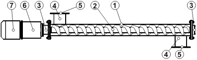 Винтовой конвейер (шнек) состоит из следующих узлов и деталей: корпуса (1), винта (2), подшипниковых опор (3), загрузочного и разгрузочного отверстия (4) с присоединительными фланцами (5), редуктора (6) и приводного электродвигателя (7) (Рис. 1). При вращении винта транспортируемый материал перемещается от загрузочного отверстия к разгрузочному.