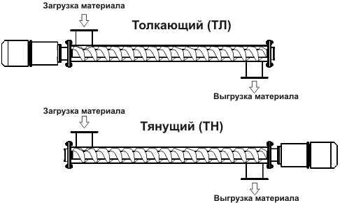 При реализации толкающей схемы привод подающего винта расположен со стороны загрузочного отверстия. При тянущей схеме привод подающего винта расположен со стороны разгрузочного отверстия. Указанные схемы установки привода подающего винта не оказывают влияние на производительность винтового конвейера и назначаются исходя из условий обеспечения доступа к приводу для его обслуживания.