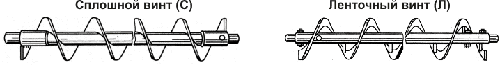 В зависимости от вида транспортируемого материала винтовой конвейер может оснащаться сплошным или ленточным винтами. Так, для транспортирования хорошо сыпучих материалов, к которым относятся цемент, песок, гипс, мел, шлак, известь порошковая, применяют сплошной подающий винт (С). Для подачи кусковых материалов, таких как гравий, известняк, негранулированный шлак, целесообразно использовать ленточный винт (Л). (Рис. 3)